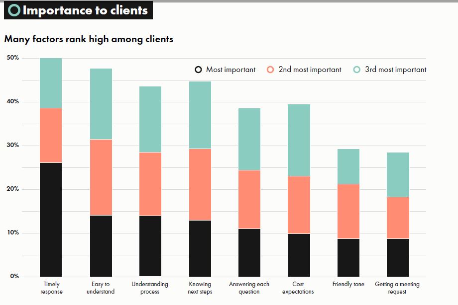 The lack of accountability stems from the “cult of the individual.” Be that as it may, I would boil it down to the “exception is the rule” culture – which permeates many a firm. The Paradox of Growth for Law Firms On the one hand, law firms say they want to grow their revenue yet seem to have trouble finding business. On the other hand, clients continue to struggle, finding help with their legal problems. Why hasn't the normal laws of supply and demand addressed this paradox – poor client service. With occasional small variations, the following findings are consistently identified in studies of clients of what they are looking for in client service from their lawyer/law firm. Chart 3 - Source - Clio - Legal Trends Report - 2019 (Click image for larger version.) The gap between what clients want and what they get is embarrassing and a direct factor in the continuation of the paradox. CLIO conducted one of the more recent studies. Their study assessed the client services provided by 1,000 randomly selected law firms in the United States. In addition to emailing the 1,000 firms, they phoned 500 of these firms. They tailored their outreach to correspond with the type of law practiced by each firm, across five different issue types: