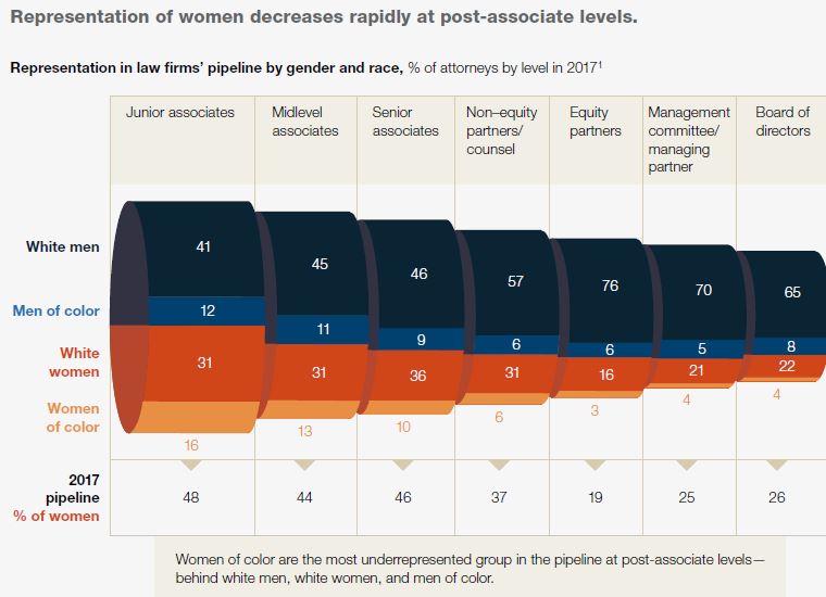 Wishes for Canadian Law Firms in 2020While counterintuitive and not said as a business development promo, my hope for law firms in 2020 is that you make mistakes. Neil Gaiman said, "if you are making mistakes, then you are making new things, trying new things, learning, living, pushing yourself, changing yourself, changing your world. You're doing things you've never done before, and more importantly, you're doing something".If your firm is to be successful in 2020 and beyond, there are challenges your firm needs to change how they approach them. What are these challenges you might ask? There is a commonality in the challenges faced by firms, but because there are no "cookie-cutter" solutions (beware of anyone pitching you that there is), the priority will vary from firm to firm. The challenges are not in any particular order. Gender Diversity Issue is A Firm Issue, not a Women's Issue Chart 1 - Source Catalyst – Women in Law: Quick Take - October 2018